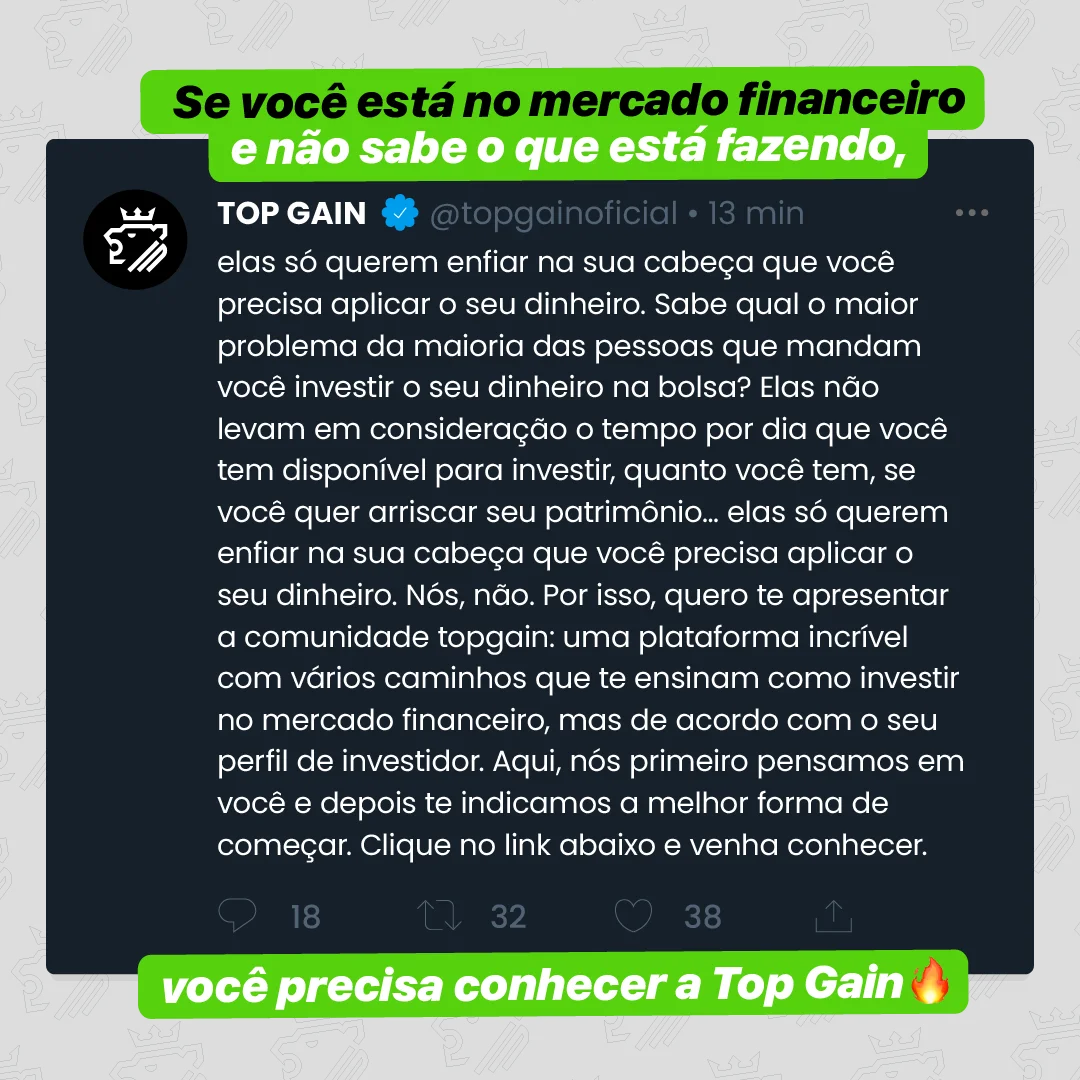 #TOPGAIN #MARKETINGDIGITAL #LANÇAMENTOS #FREELADESIGN #CRIATIVOS #CAPTAÇÃO #TRADER #INVESTIMENTOS #TAPEREADING #ANÁLISEGRÁFICA #MERCADODEOPÇÕES #BOLSADEVALORES #CRIPTOMOEDAS